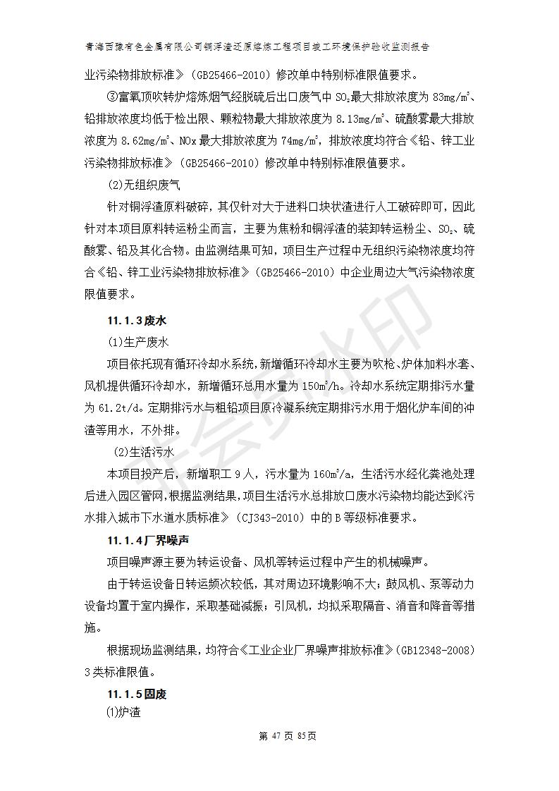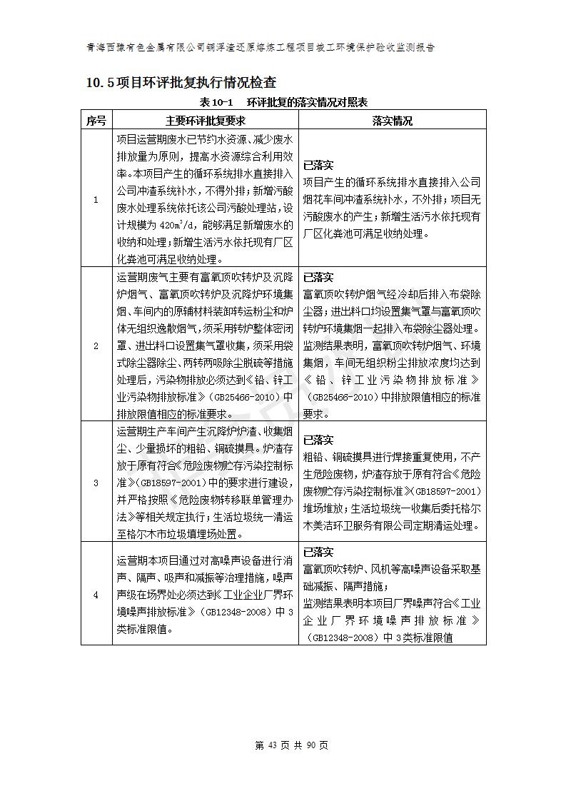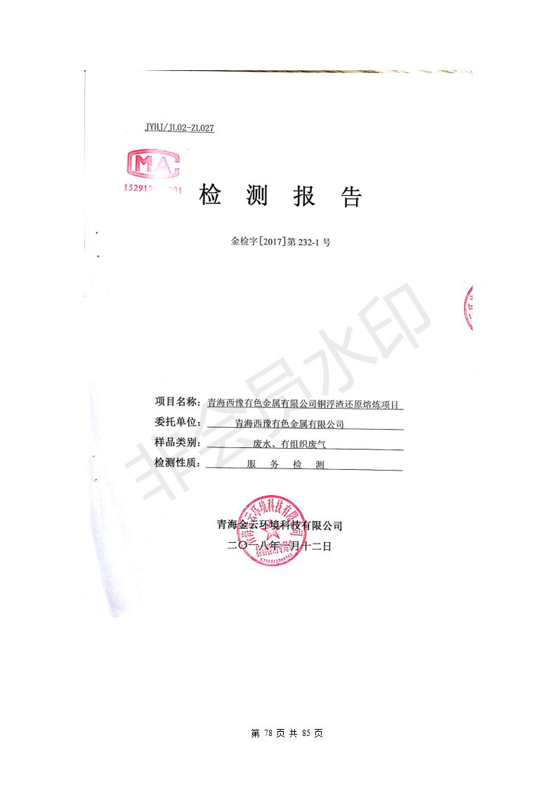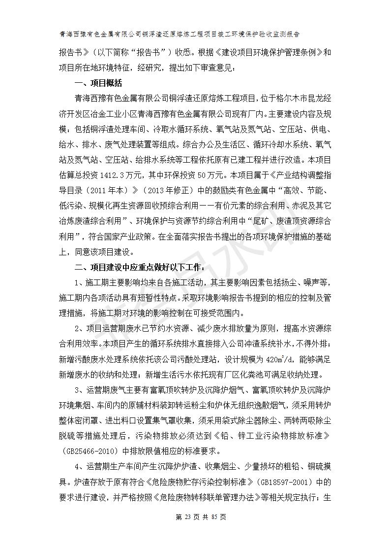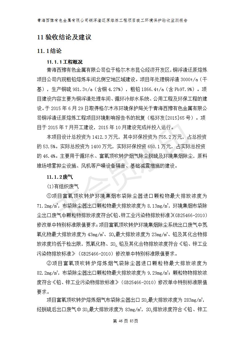 青海西豫有色金屬有限公司銅浮渣還原熔煉工程項(xiàng)目竣工環(huán)境保護(hù)驗(yàn)收監(jiān)測報(bào)告公示發(fā)布日期:(2018-11-23) 點(diǎn)擊次數(shù):2691 |
