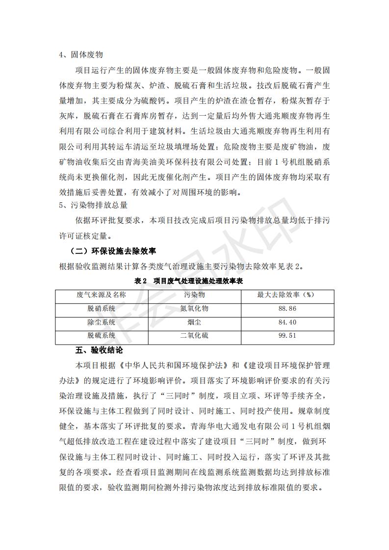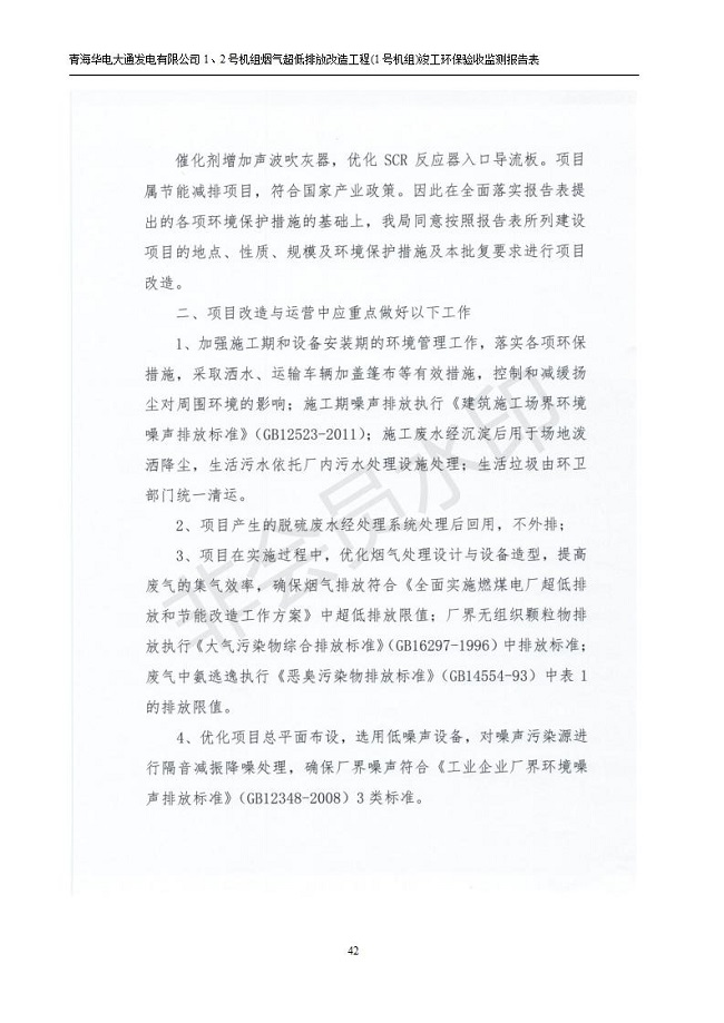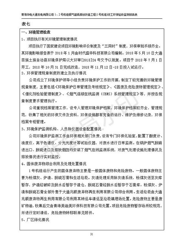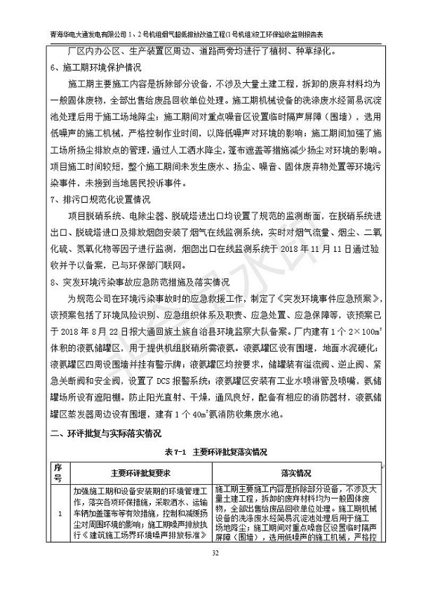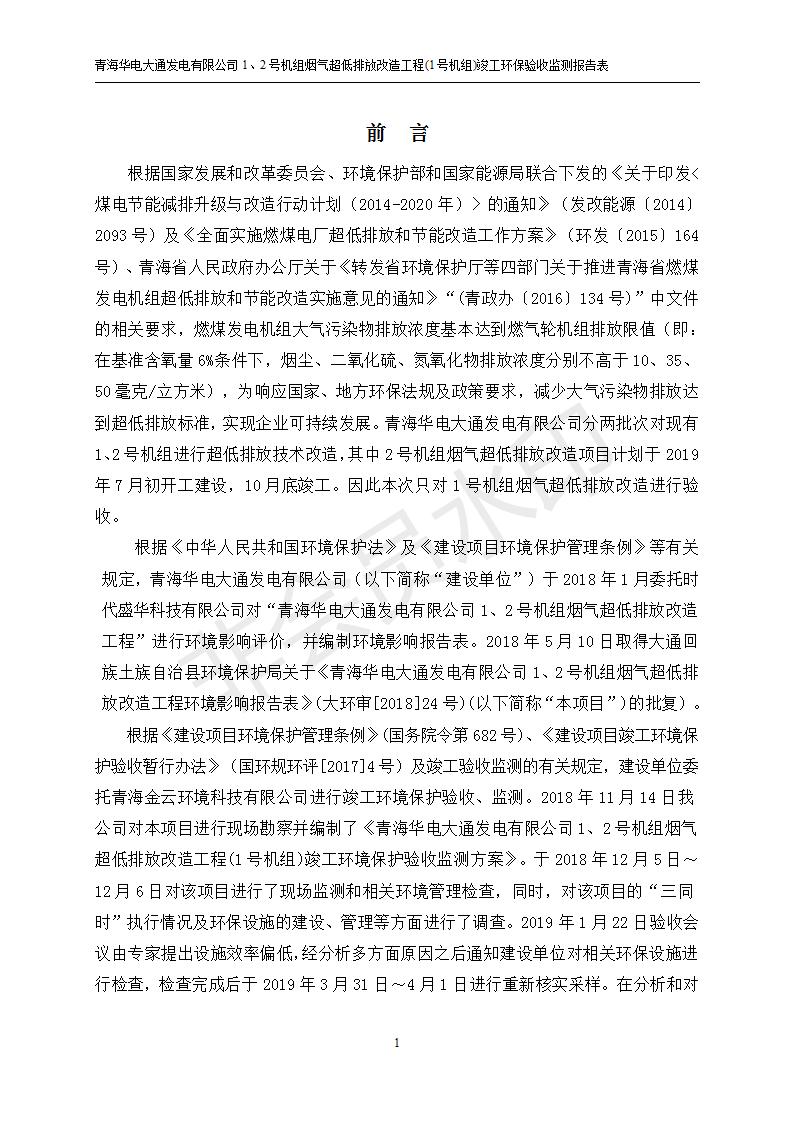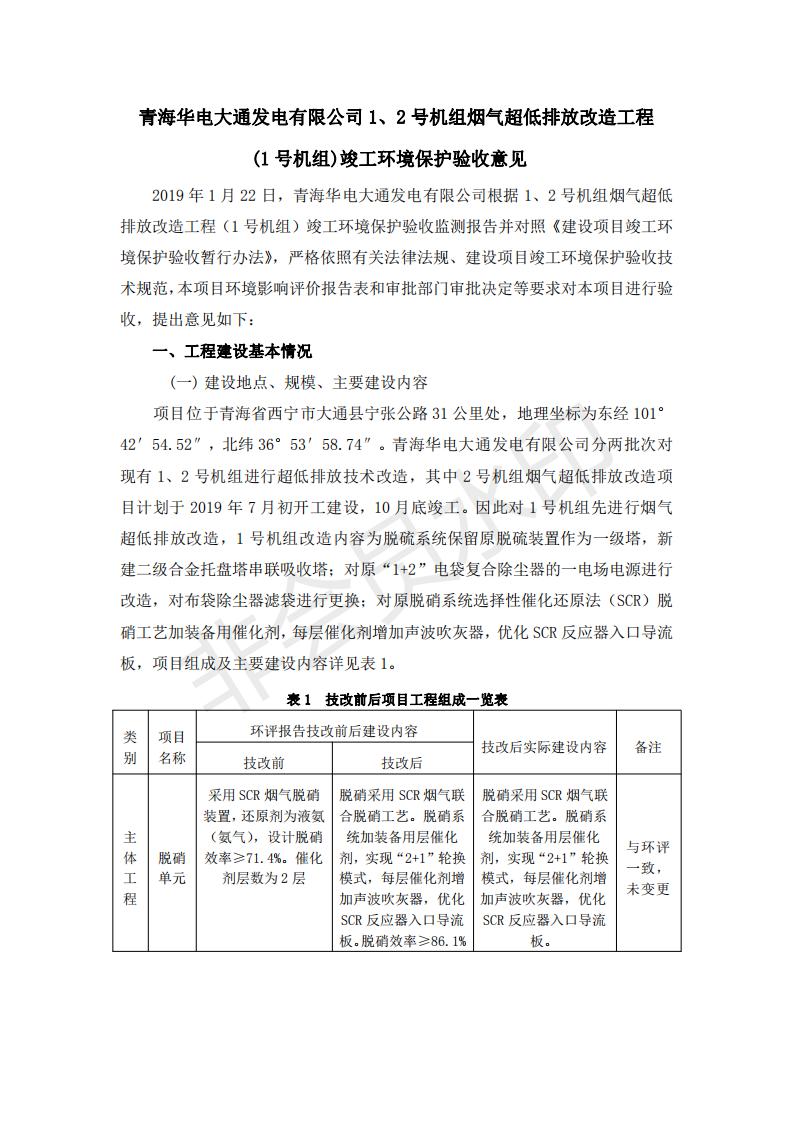 根據(jù)中華人民共和國(guó)國(guó)務(wù)院令第682號(hào)《國(guó)務(wù)院關(guān)于修改〈建設(shè)項(xiàng)目環(huán)境保護(hù)管理?xiàng)l例〉的決定》和《建設(shè)項(xiàng)目竣工環(huán)境保護(hù)驗(yàn)收暫行辦法》(國(guó)務(wù)院令682號(hào)),青海華電大通發(fā)電有限公司1、2號(hào)機(jī)組煙氣超低排放改造工程(1號(hào)機(jī)組) (包括竣工環(huán)境保護(hù)驗(yàn)收監(jiān)測(cè)報(bào)告表和驗(yàn)收意見)公示如下。 一、項(xiàng)目名稱:青海華電大通發(fā)電有限公司1、2號(hào)機(jī)組煙氣超低排放改造工程(1號(hào)機(jī)組) 竣工環(huán)境保護(hù)驗(yàn)收監(jiān)測(cè)報(bào)告表 二、地點(diǎn):青海省西寧市大通縣寧張公路31公里處 三、建設(shè)單位:青海華電大通發(fā)電有限公司 四、建設(shè)內(nèi)容:1號(hào)機(jī)組煙氣超低排放改造,1號(hào)機(jī)組改造內(nèi)容為脫硫系統(tǒng)保留原脫硫裝置作為一級(jí)塔,新建二級(jí)合金托盤塔串聯(lián)吸收塔;對(duì)原“1+2”電袋復(fù)合除塵器的一電場(chǎng)電源進(jìn)行改造,對(duì)布袋除塵器濾袋進(jìn)行更換;對(duì)原脫硝系統(tǒng)選擇性催化還原法(SCR)脫硝工藝加裝備用催化劑,每層催化劑增加聲波吹灰器,優(yōu)化SCR反應(yīng)器入口導(dǎo)流板。 五、聯(lián)系人:張工 六、聯(lián)系電 話:0971-6515411 七、公示時(shí)間:二〇一九年二月十三日至二〇一九年三月十二日 公示期間,對(duì)上述公示內(nèi)容如有異議,請(qǐng)以書面形式反饋,個(gè)人須署真實(shí)姓名,單位須加蓋公章。