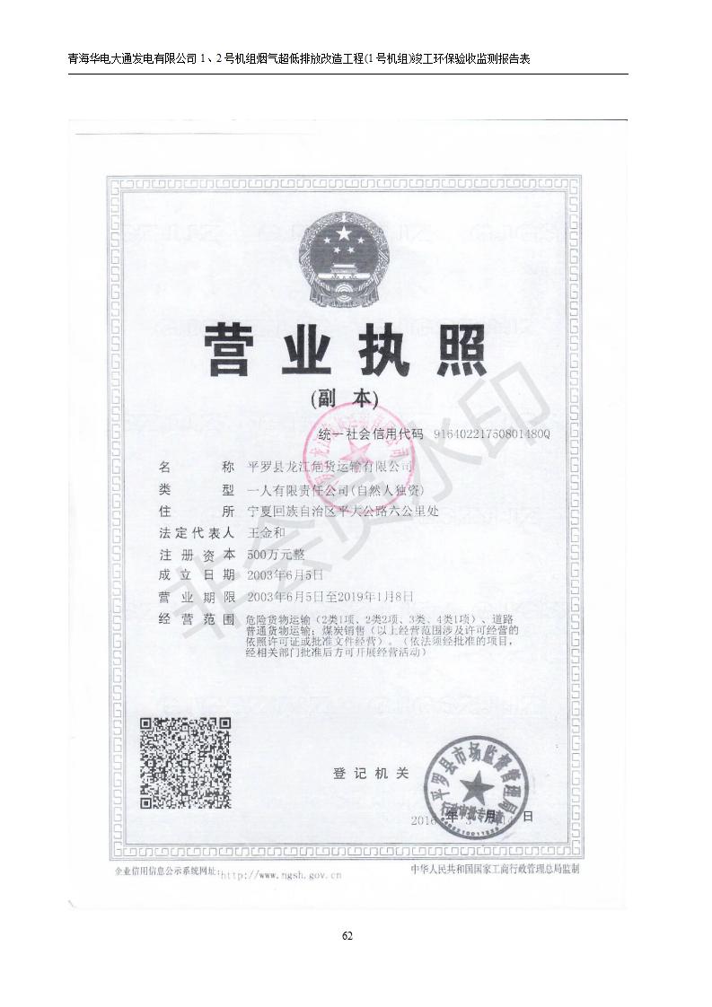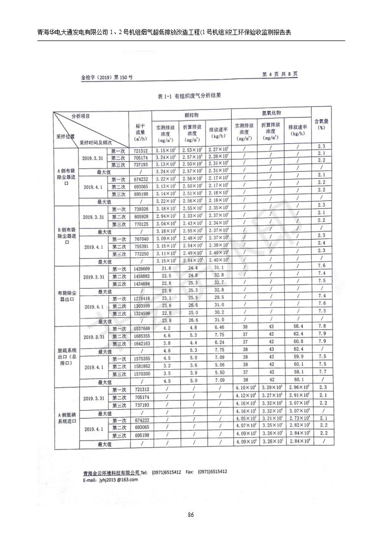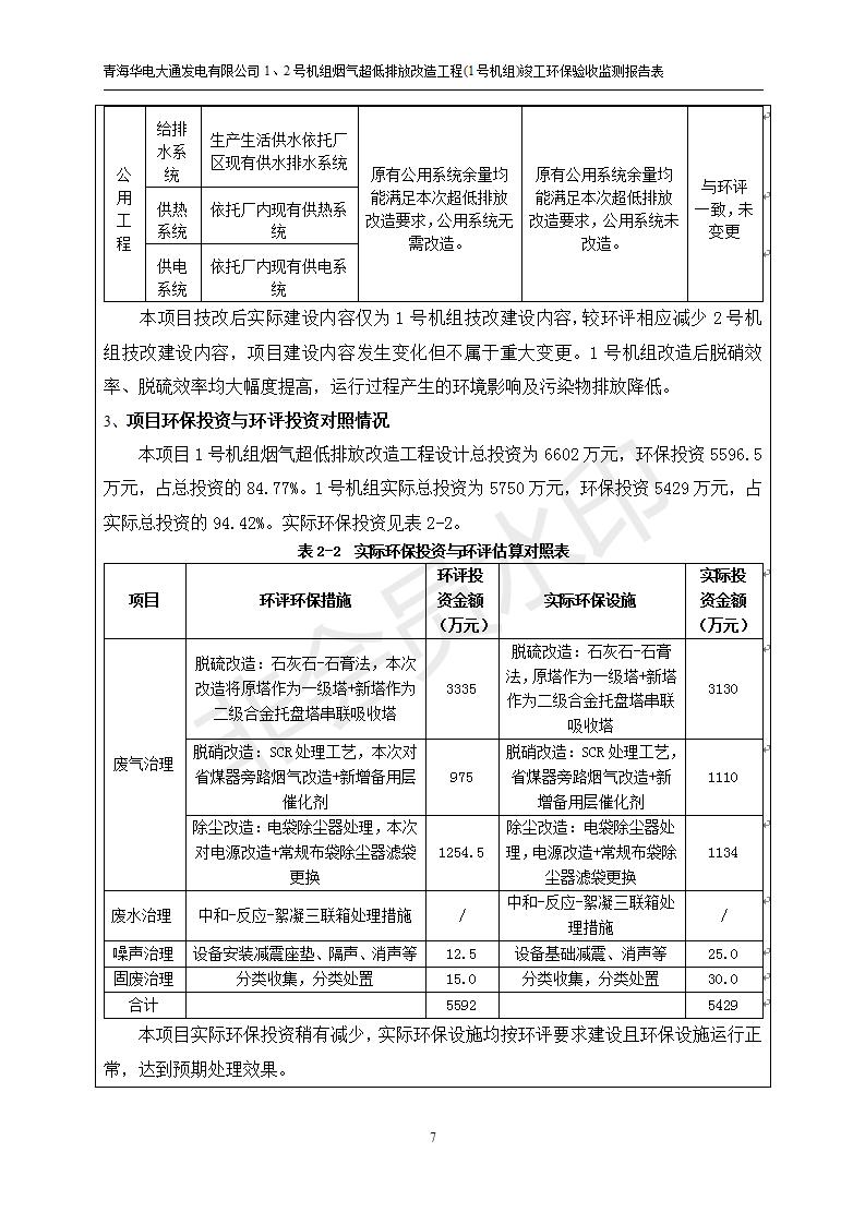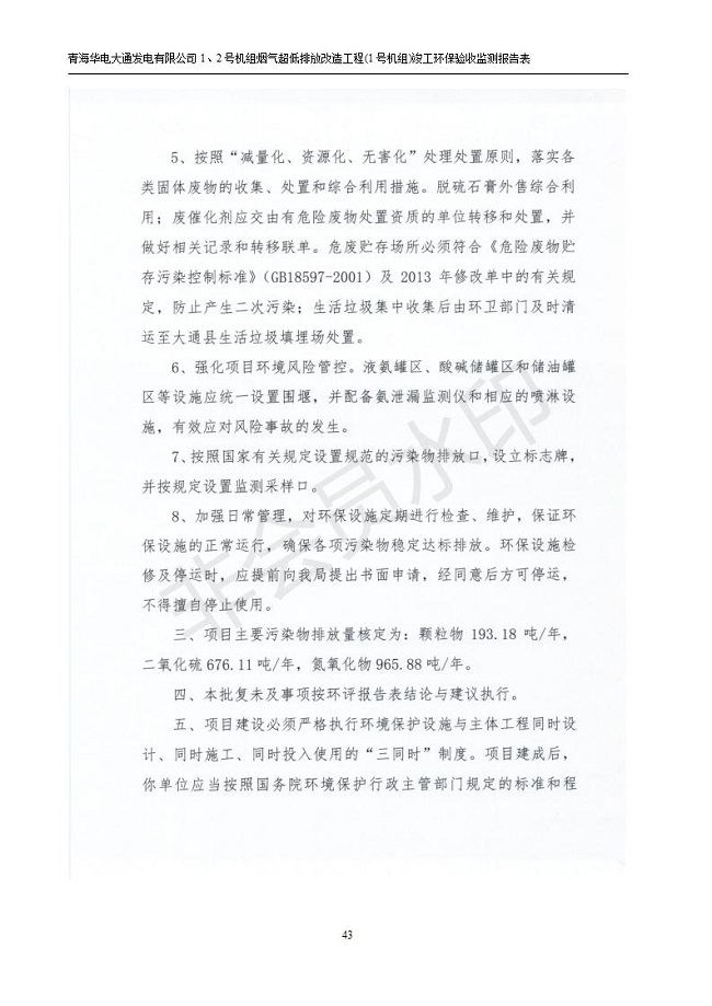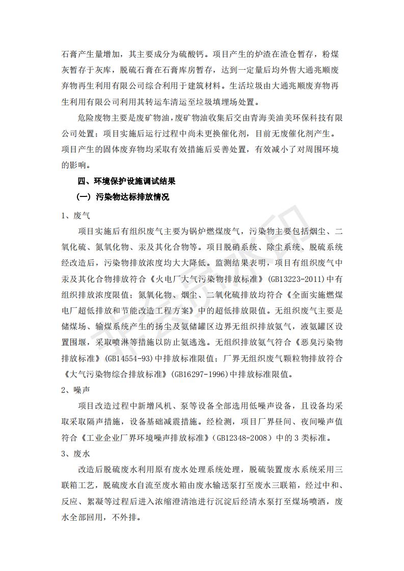 根據(jù)中華人民共和國(guó)國(guó)務(wù)院令第682號(hào)《國(guó)務(wù)院關(guān)于修改〈建設(shè)項(xiàng)目環(huán)境保護(hù)管理?xiàng)l例〉的決定》和《建設(shè)項(xiàng)目竣工環(huán)境保護(hù)驗(yàn)收暫行辦法》(國(guó)務(wù)院令682號(hào)),青海華電大通發(fā)電有限公司1、2號(hào)機(jī)組煙氣超低排放改造工程(1號(hào)機(jī)組) (包括竣工環(huán)境保護(hù)驗(yàn)收監(jiān)測(cè)報(bào)告表和驗(yàn)收意見)公示如下。 一、項(xiàng)目名稱:青海華電大通發(fā)電有限公司1、2號(hào)機(jī)組煙氣超低排放改造工程(1號(hào)機(jī)組) 竣工環(huán)境保護(hù)驗(yàn)收監(jiān)測(cè)報(bào)告表 二、地點(diǎn):青海省西寧市大通縣寧張公路31公里處 三、建設(shè)單位:青海華電大通發(fā)電有限公司 四、建設(shè)內(nèi)容:1號(hào)機(jī)組煙氣超低排放改造,1號(hào)機(jī)組改造內(nèi)容為脫硫系統(tǒng)保留原脫硫裝置作為一級(jí)塔,新建二級(jí)合金托盤塔串聯(lián)吸收塔;對(duì)原“1+2”電袋復(fù)合除塵器的一電場(chǎng)電源進(jìn)行改造,對(duì)布袋除塵器濾袋進(jìn)行更換;對(duì)原脫硝系統(tǒng)選擇性催化還原法(SCR)脫硝工藝加裝備用催化劑,每層催化劑增加聲波吹灰器,優(yōu)化SCR反應(yīng)器入口導(dǎo)流板。 五、聯(lián)系人:張工 六、聯(lián)系電 話:0971-6515411 七、公示時(shí)間:二〇一九年二月十三日至二〇一九年三月十二日 公示期間,對(duì)上述公示內(nèi)容如有異議,請(qǐng)以書面形式反饋,個(gè)人須署真實(shí)姓名,單位須加蓋公章。