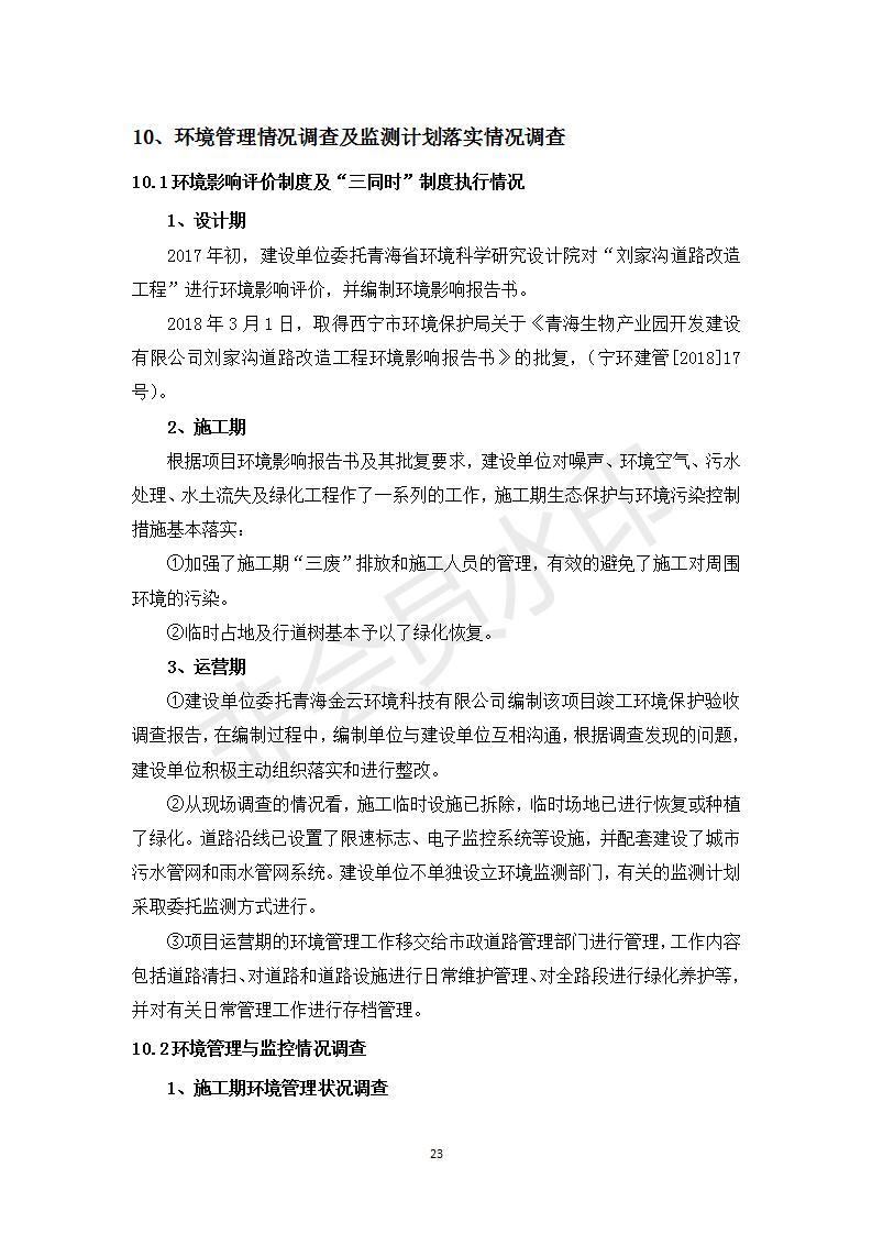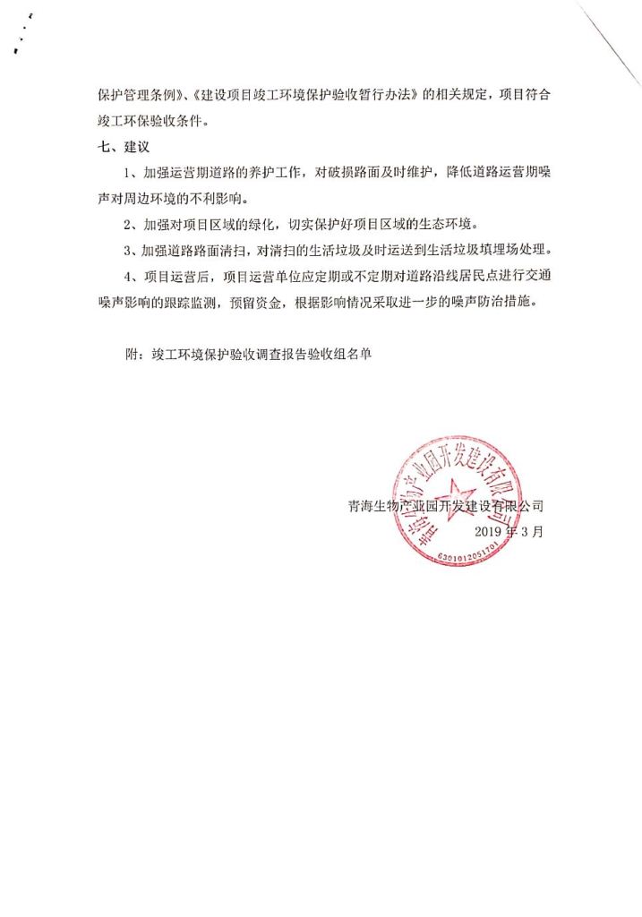 根據(jù)中華人民共和國(guó)務(wù)院令第682號(hào)《國(guó)務(wù)院關(guān)于修改〈建設(shè)項(xiàng)目環(huán)境保護(hù)管理?xiàng)l例〉的決定》和《建設(shè)項(xiàng)目竣工環(huán)境保護(hù)驗(yàn)收暫行辦法》(國(guó)務(wù)院令682號(hào)),劉家溝道路改造工程竣工環(huán)境保護(hù)驗(yàn)收內(nèi)容(包括竣工環(huán)境保護(hù)驗(yàn)收調(diào)查報(bào)告和驗(yàn)收意見)公示如下: 一、項(xiàng)目名稱:劉家溝道路改造工程 二、地點(diǎn):青海省西寧市城北區(qū)生物園區(qū) 三、建設(shè)單位:生物產(chǎn)業(yè)園開發(fā)建設(shè)有限公司 四、建設(shè)內(nèi)容:劉家溝道路經(jīng)改造后全長(zhǎng)1533m,道路呈東西向展布,道路紅線為30m。設(shè)計(jì)時(shí)速為40km/h,雙向4車道。 五、公示時(shí)間:二〇一九年三月十四日至二〇一九年四月十一日 六、聯(lián)系人:張工 公示期間,對(duì)上述公示內(nèi)容如有異議,請(qǐng)以書面形式反饋,個(gè)人須署真實(shí)姓名,單位須加蓋公章。