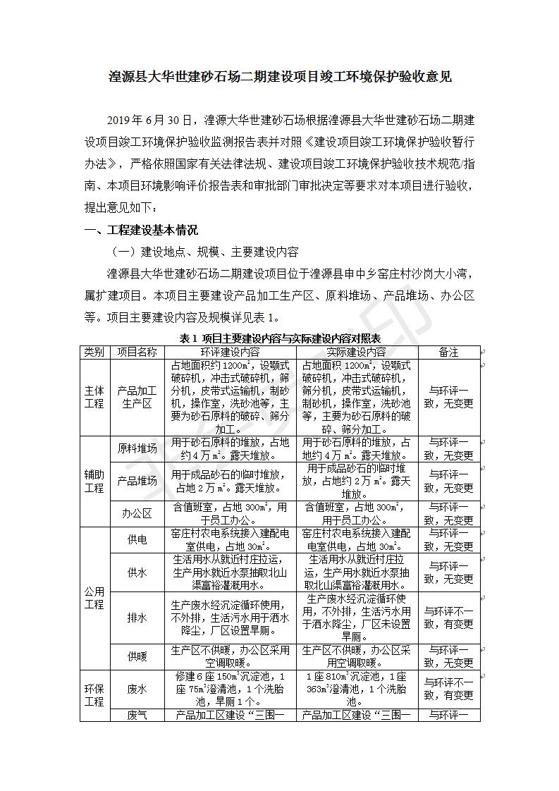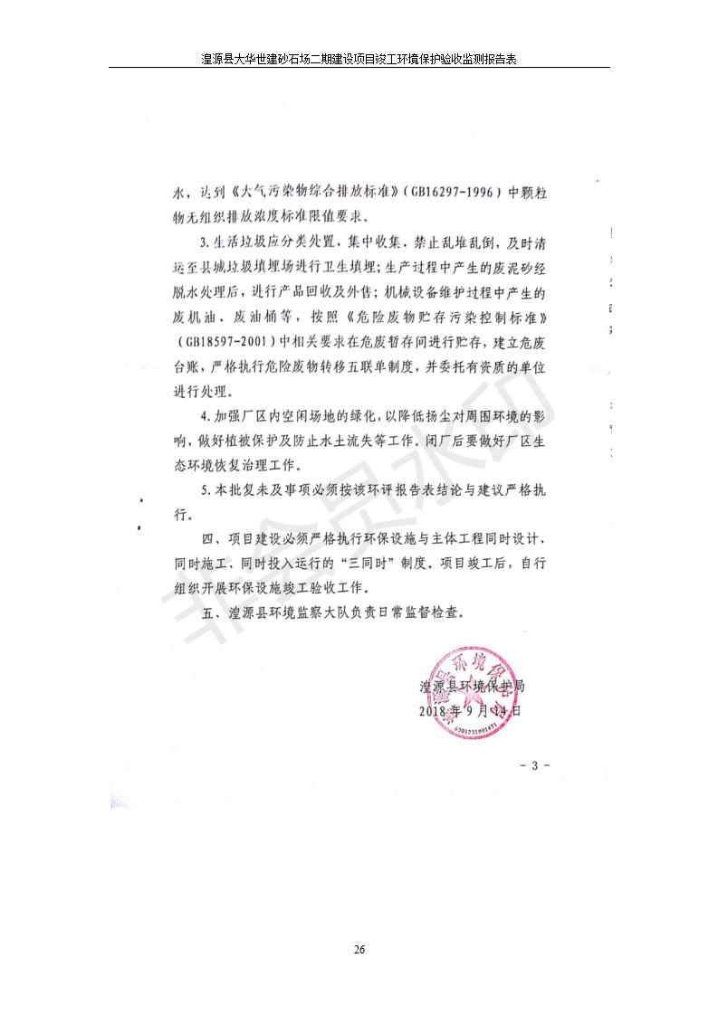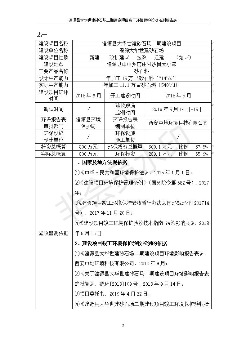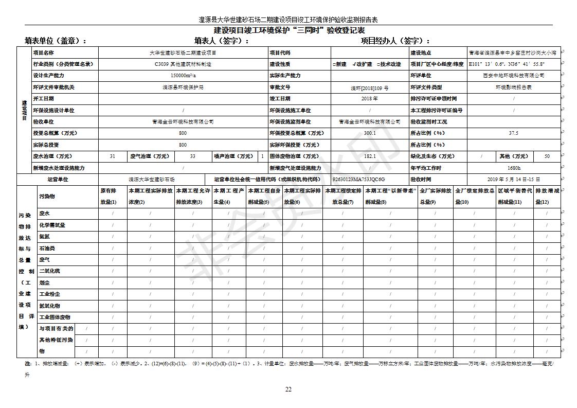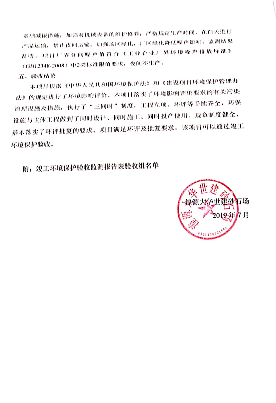 根據(jù)中華人民共和國國務(wù)院令第682號《國務(wù)院關(guān)于修改〈建設(shè)項(xiàng)目環(huán)境保護(hù)管理?xiàng)l例〉的決定》和《建設(shè)項(xiàng)目竣工環(huán)境保護(hù)驗(yàn)收暫行辦法》(國務(wù)院令682號),湟源大華世建砂石場湟源縣大華世建砂石場二期建設(shè)項(xiàng)目(包括竣工環(huán)境保護(hù)驗(yàn)收監(jiān)測報(bào)告表和驗(yàn)收意見)公示如下。 一、項(xiàng)目名稱:湟源縣大華世建砂石場二期建設(shè)項(xiàng)目 二、地點(diǎn):湟源縣申中鄉(xiāng)窯莊村沙崗大小灣 三、建設(shè)單位:湟源大華世建砂石場 四、建設(shè)內(nèi)容:項(xiàng)目主要建設(shè)砂石料產(chǎn)品加工生產(chǎn)區(qū)、原料堆場、產(chǎn)品堆場、辦公區(qū)等。五、聯(lián)系人:張工 六、聯(lián)系電 話:0971-6515411 七、公示時間:二〇一九年七月二十五日至二〇一九年八月二十一日公示期間,對上述公示內(nèi)容如有異議,請以書面形式反饋,個人須署真實(shí)姓名,單位須加蓋公章。