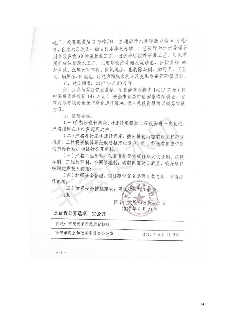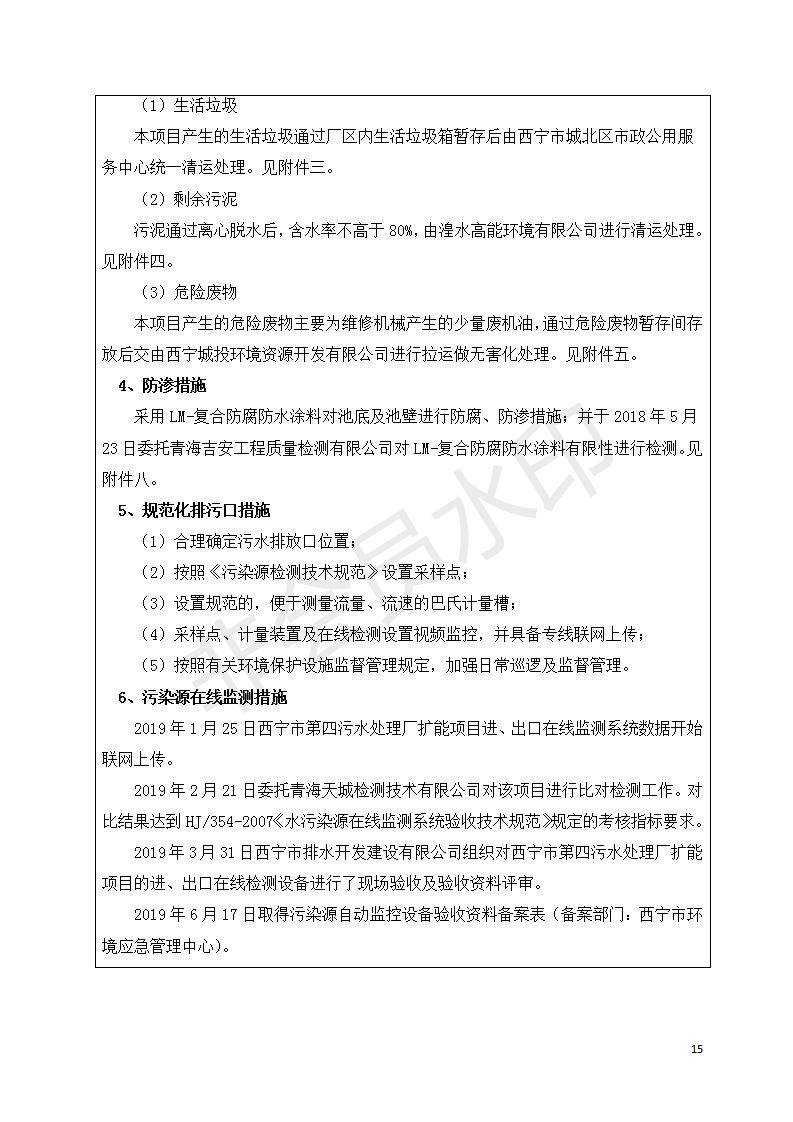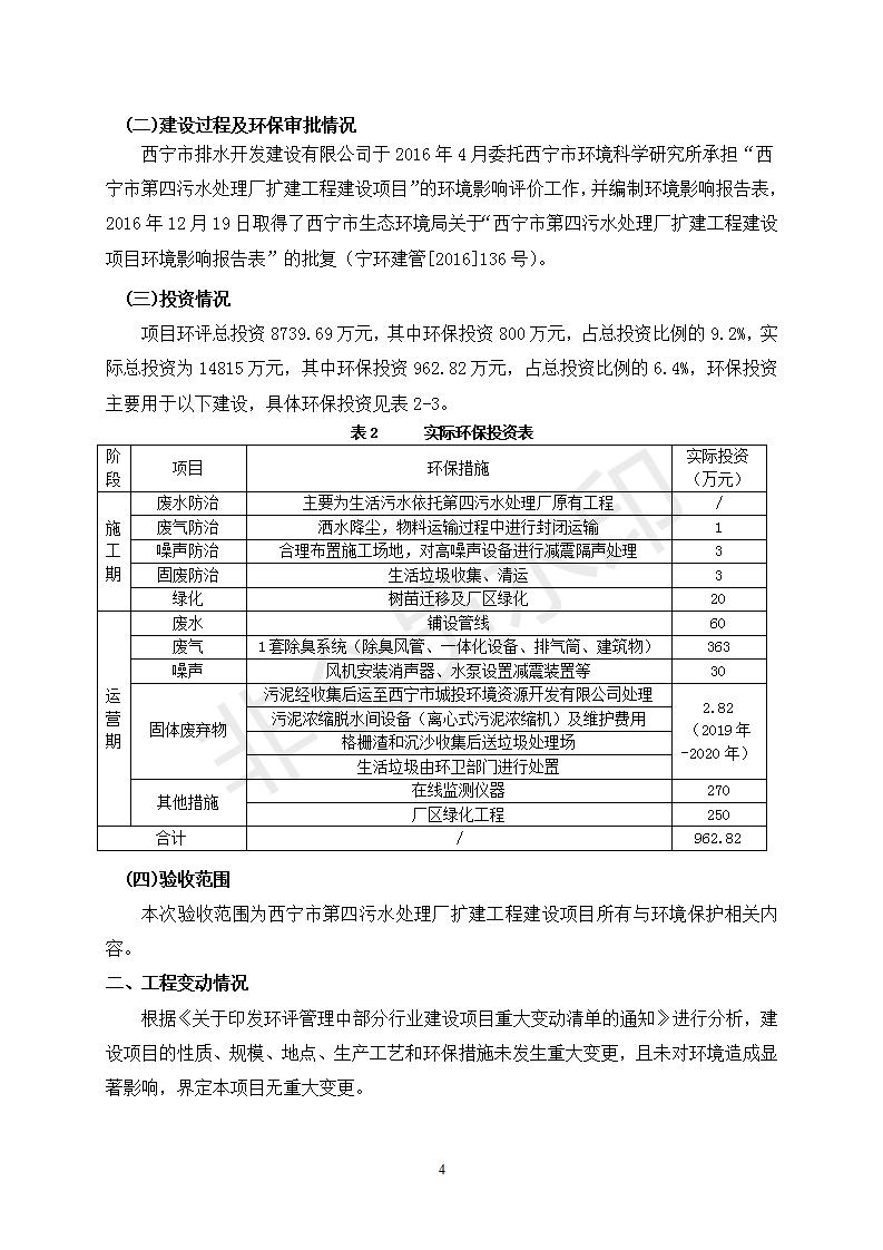 根據(jù)中華人民共和國國務(wù)院令第682號《國務(wù)院關(guān)于修改〈建設(shè)項目環(huán)境保護管理條例〉的決定》和《建設(shè)項目竣工環(huán)境保護驗收暫行辦法》(國務(wù)院令682號),西寧市第四污水處理廠擴建工程建設(shè)項目(包括竣工環(huán)境保護驗收監(jiān)測報告表和驗收意見)公示如下。 一、項目名稱:西寧市第四污水處理廠擴建工程建設(shè)項目 二、地點:五四西路南側(cè),原西寧市第四污水處理廠西側(cè)用地 三、建設(shè)單位:西寧市排水開發(fā)建設(shè)有限公司 四、建設(shè)內(nèi)容:第四污水處理廠擴建工程五、聯(lián)系人:張工 六、聯(lián)系電 話:0971-6515411 七、公示時間:二〇一九年九月十七日至二〇一九年十月十八日公示期間,對上述公示內(nèi)容如有異議,請以書面形式反饋,個人須署真實姓名,單位須加蓋公章。