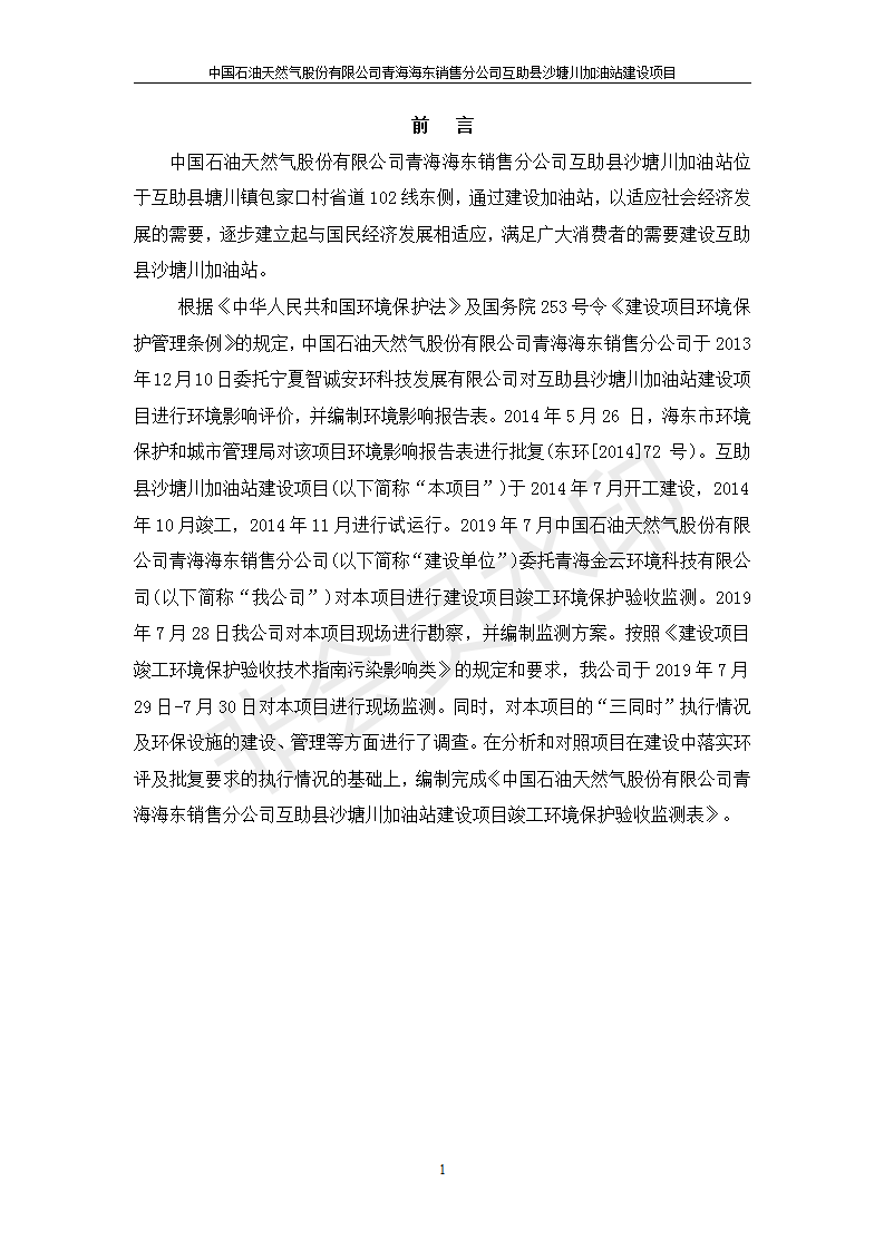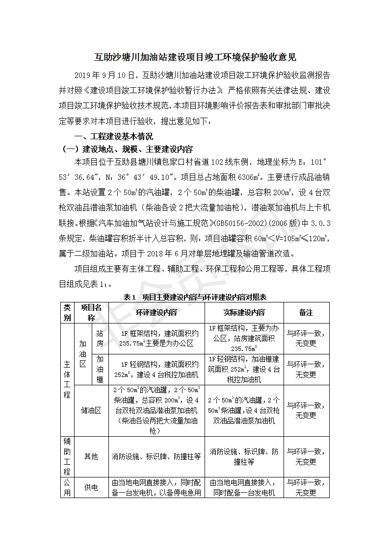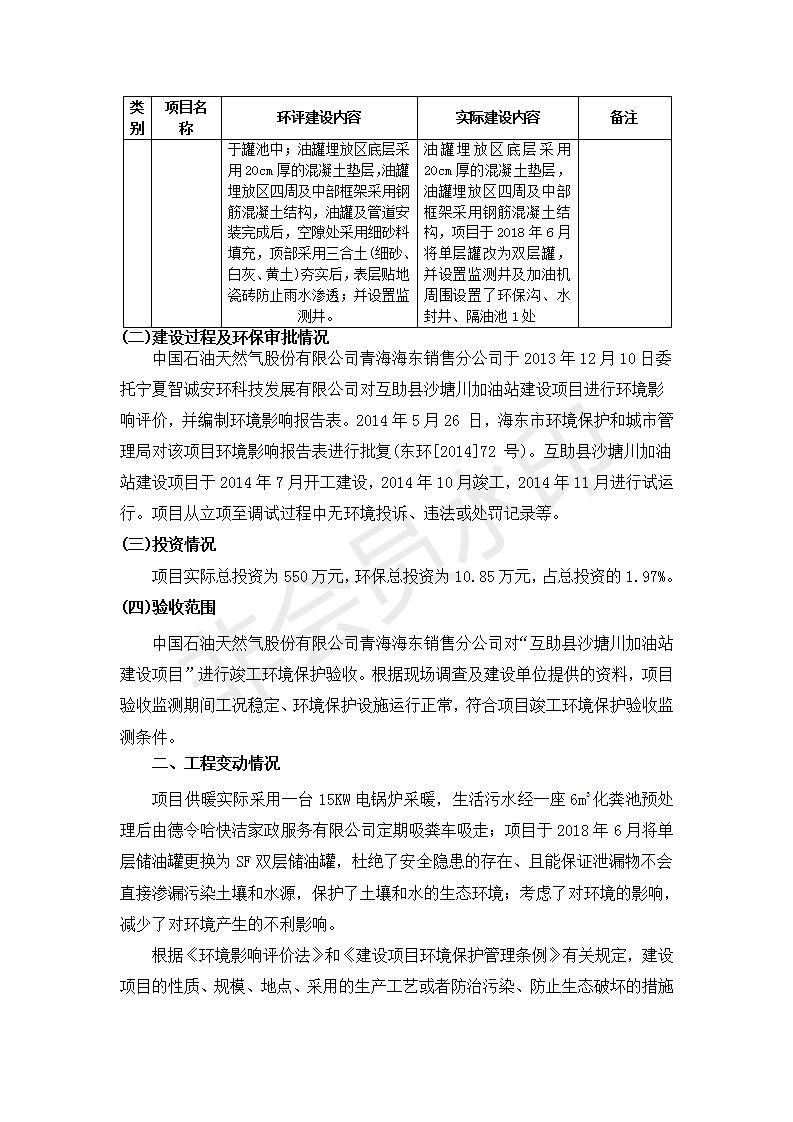 根據(jù)中華人民共和國國務(wù)院令第682號(hào)《國務(wù)院關(guān)于修改〈建設(shè)項(xiàng)目環(huán)境保護(hù)管理?xiàng)l例〉的決定》和《建設(shè)項(xiàng)目竣工環(huán)境保護(hù)驗(yàn)收暫行辦法》(國務(wù)院令682號(hào)),互助縣沙塘川加油站建設(shè)項(xiàng)目(包括竣工環(huán)境保護(hù)驗(yàn)收監(jiān)測報(bào)告表和驗(yàn)收意見)公示如下。 一、項(xiàng)目名稱:互助縣沙塘川加油站建設(shè)項(xiàng)目 二、地點(diǎn):互助縣塘川鎮(zhèn)包家口村 六、聯(lián)系電話:0971-6515411 七、公示時(shí)間:二〇一九年九月二十七日至二〇一九年十月二十九日 公示期間,對(duì)上述公示內(nèi)容如有異議,請(qǐng)以書面形式反饋,個(gè)人須署真實(shí)姓名,單位須加蓋公章。