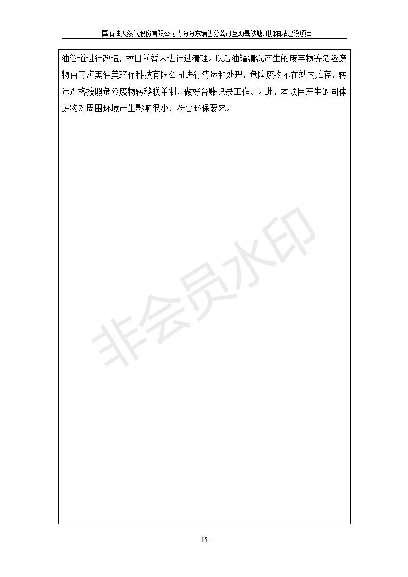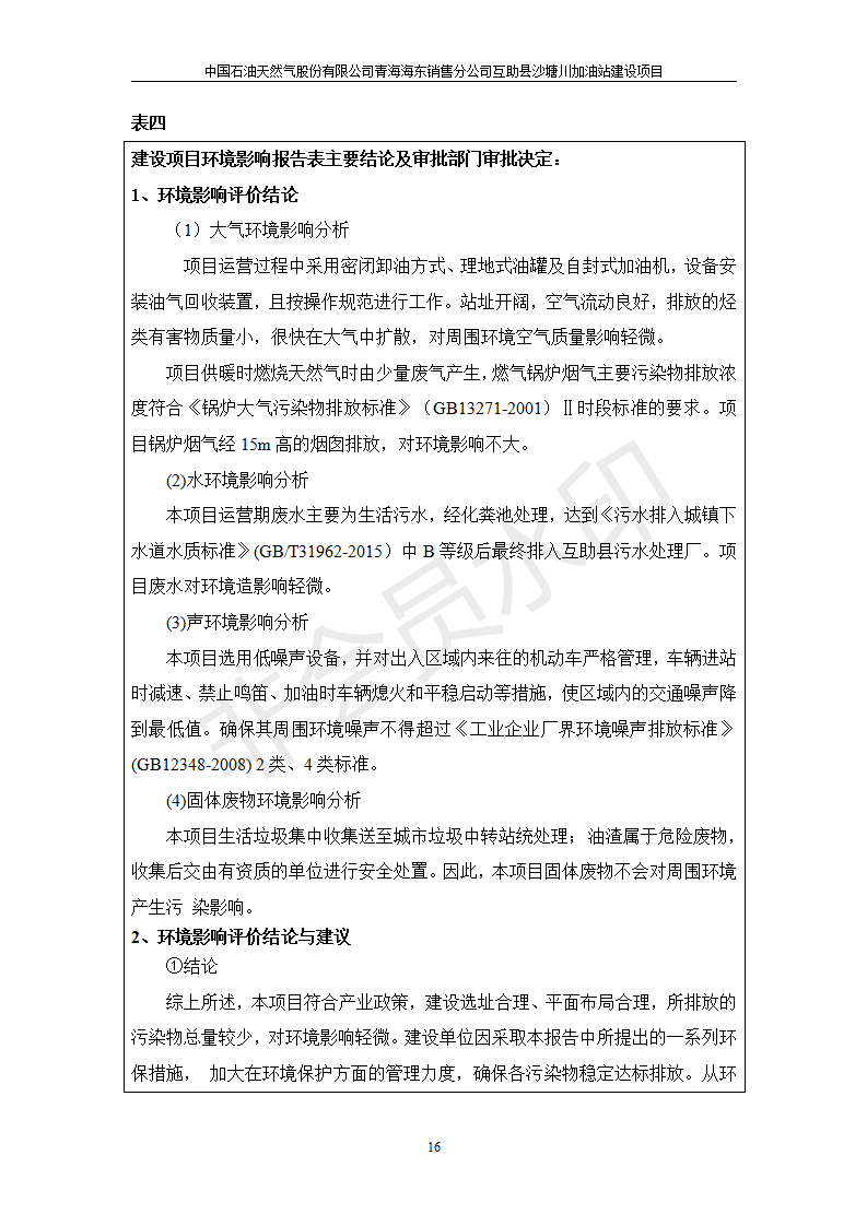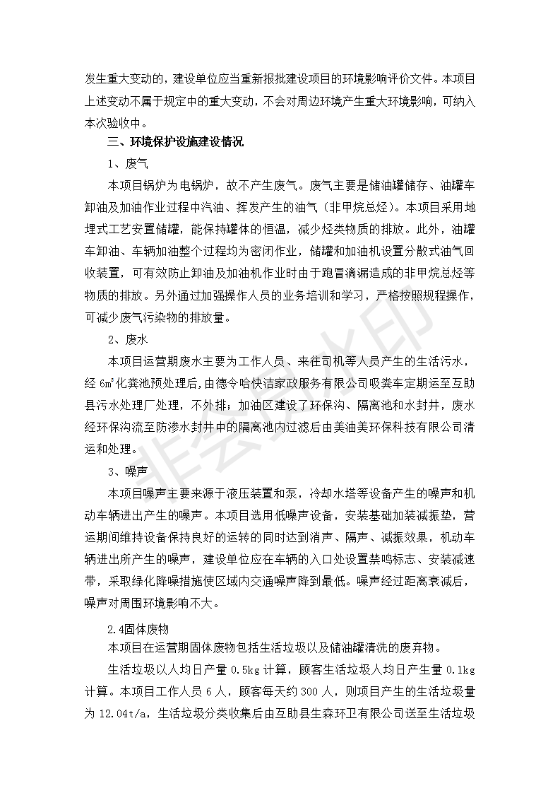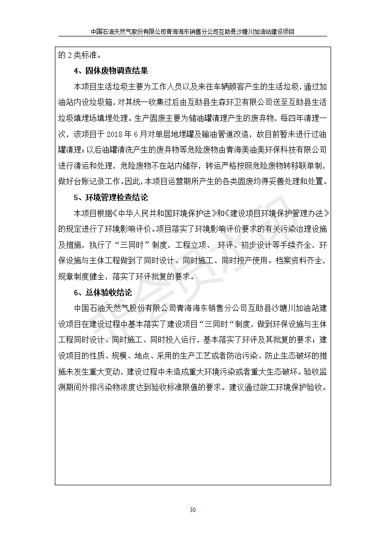 根據(jù)中華人民共和國國務(wù)院令第682號(hào)《國務(wù)院關(guān)于修改〈建設(shè)項(xiàng)目環(huán)境保護(hù)管理?xiàng)l例〉的決定》和《建設(shè)項(xiàng)目竣工環(huán)境保護(hù)驗(yàn)收暫行辦法》(國務(wù)院令682號(hào)),互助縣沙塘川加油站建設(shè)項(xiàng)目(包括竣工環(huán)境保護(hù)驗(yàn)收監(jiān)測報(bào)告表和驗(yàn)收意見)公示如下。 一、項(xiàng)目名稱:互助縣沙塘川加油站建設(shè)項(xiàng)目 二、地點(diǎn):互助縣塘川鎮(zhèn)包家口村 六、聯(lián)系電話:0971-6515411 七、公示時(shí)間:二〇一九年九月二十七日至二〇一九年十月二十九日 公示期間,對(duì)上述公示內(nèi)容如有異議,請(qǐng)以書面形式反饋,個(gè)人須署真實(shí)姓名,單位須加蓋公章。