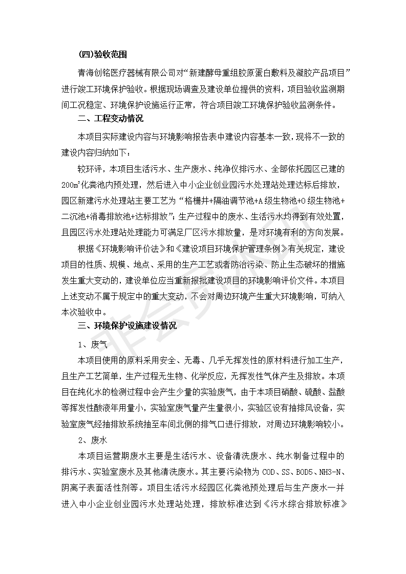 根據(jù)中華人民共和國國務(wù)院令第682號《國務(wù)院關(guān)于修改〈建設(shè)項(xiàng)目環(huán)境保護(hù)管理?xiàng)l例〉的決定》和《建設(shè)項(xiàng)目竣工環(huán)境保護(hù)驗(yàn)收暫行辦法》(國務(wù)院令682號),新建酵母重組膠原蛋白敷料及凝膠產(chǎn)品項(xiàng)目(包括竣工環(huán)境保護(hù)驗(yàn)收監(jiān)測報(bào)告表和驗(yàn)收意見)公示如下。 一、項(xiàng)目名稱:新建酵母重組膠原蛋白敷料及凝膠產(chǎn)品項(xiàng)目 二、地點(diǎn):西寧市生物園區(qū)經(jīng)四路26號15號樓2層 五、聯(lián)系人:董繼風(fēng) 六、聯(lián)系電話:18606125050 七、公示時(shí)間:二〇二〇年一月十三日至二〇二〇年二月十二日 公示期間,對上述公示內(nèi)容如有異議,請以書面形式反饋,個(gè)人須署真實(shí)姓名,單位須加蓋公章。