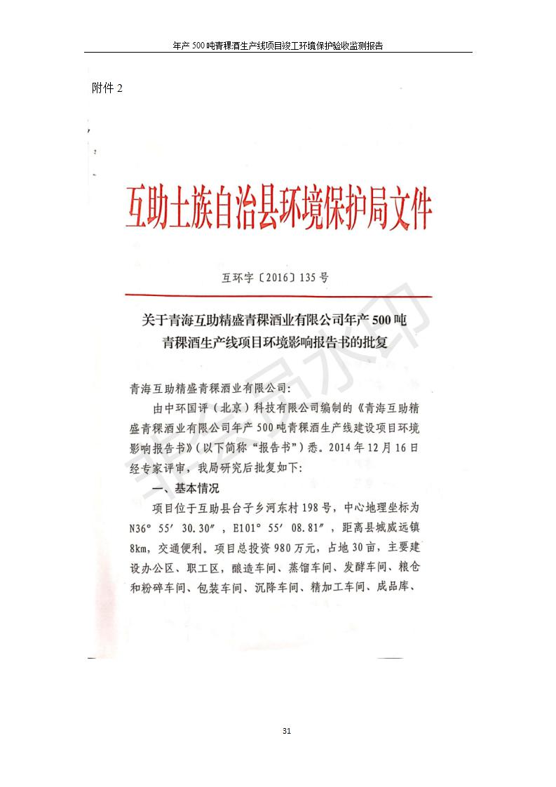 根據(jù)中華人民共和國國務(wù)院令第682號《國務(wù)院關(guān)于修改〈建設(shè)項(xiàng)目環(huán)境保護(hù)管理?xiàng)l例〉的決定》和《建設(shè)項(xiàng)目竣工環(huán)境保護(hù)驗(yàn)收暫行辦法》(國務(wù)院令682號),綜合檢測實(shí)驗(yàn)室建設(shè)項(xiàng)目(包括竣工環(huán)境保護(hù)驗(yàn)收監(jiān)測報(bào)告表和驗(yàn)收意見)公示如下。 一、項(xiàng)目名稱:青海互助精盛青稞酒業(yè)有限公司年產(chǎn)500噸青稞酒業(yè)生產(chǎn)線建設(shè)項(xiàng)目 二、地點(diǎn):青海省海東市互助土族自治縣臺子鄉(xiāng)河?xùn)|村198號